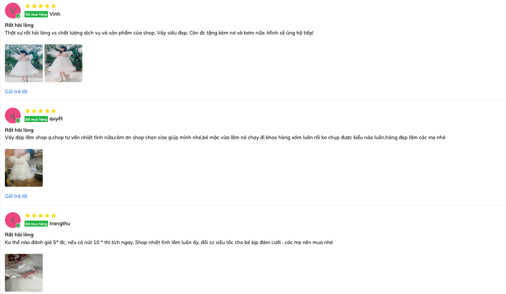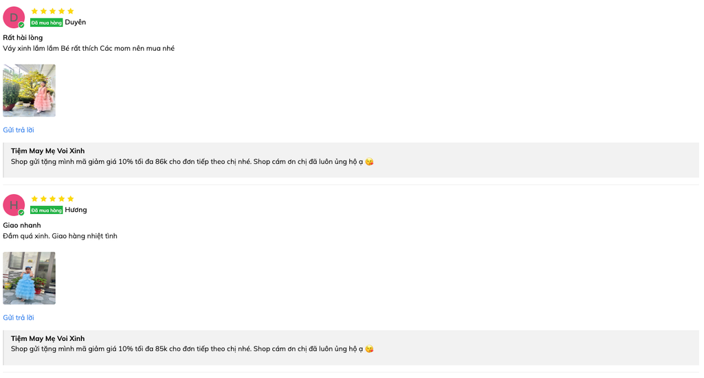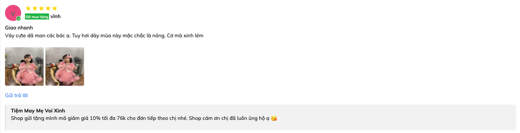 — Khách hàng yêu thích sự tỉ mỉ với món quà nhỏ kèm theo và thiết kế dễ thương của váy."Đẹp xuất sắc luôn! Tuyệt vời, mình đang hóng các mẫu mới đẹp và giá cả phù hợp từ shop."