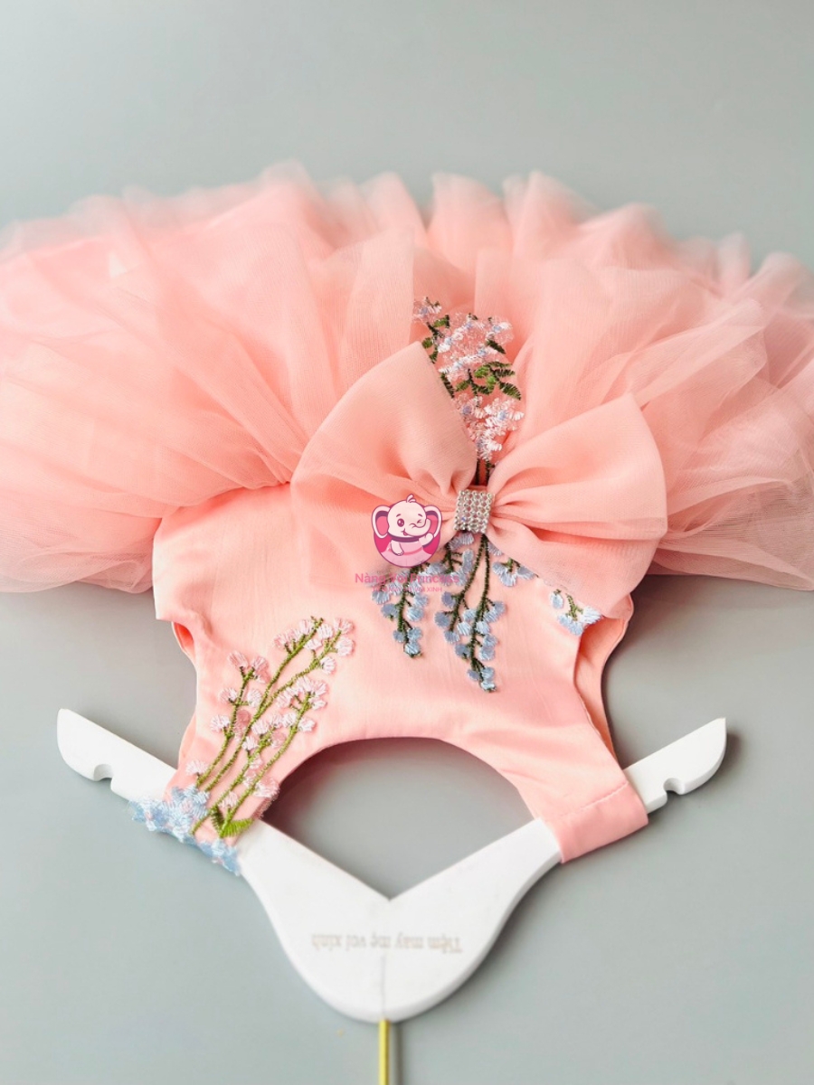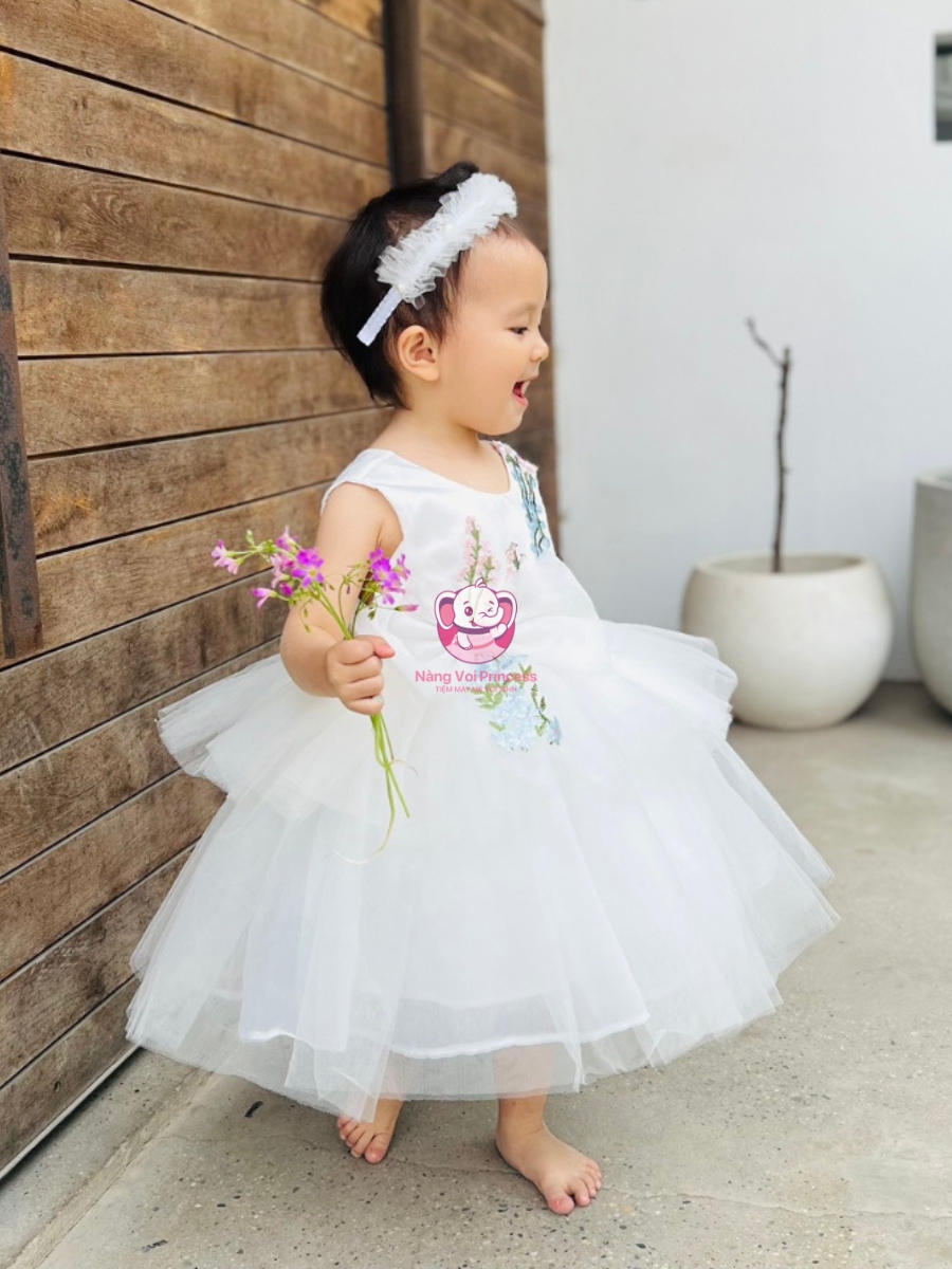 Thiết Kế 5 Lớp Tinh Tế: Váy có cấu trúc 5 lớp, bao gồm lớp lót lụa thấm hút bên trong và 4 lớp voan mỏng nhẹ bên ngoài, tạo nên độ bồng bềnh tự nhiên. Kiểu dáng sát nách khỏe khoắn giúp bé dễ dàng vận động, đồng thời tôn lên vẻ duyên dáng và điệu đà của bé yêu.