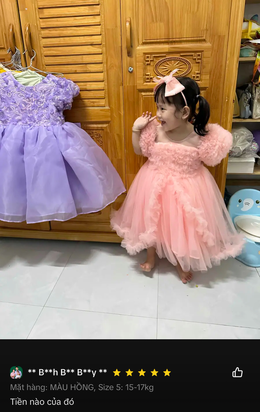 mình mua váy tặng cháu mình, phải nói là váy của shop này giá cao hơn so với shop khác nhưng chất lượng váy siêu đỉnh nhé, màu hồng bên ngoài rất tây và tươi đẹp hơn nhiều so với ảnh , vài mềm mịn lắm các mẹ ạ, đúng là tiền nào của nấy, bé cháu mình rất thích nhé, shop cũng đóng gói có hộp rất cẩn thận, địa chỉ uy tín cho mẹ nào có con gái nha