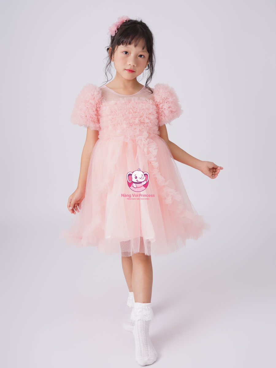 Thiết Kế Tinh Tế Với 5 Lớp: Lớp lót lụa thấm hút kết hợp cùng lớp voan mềm mại bên ngoài, cùng tay áo bồng bềnh, tạo nên vẻ duyên dáng, điệu đà cho bé yêu.