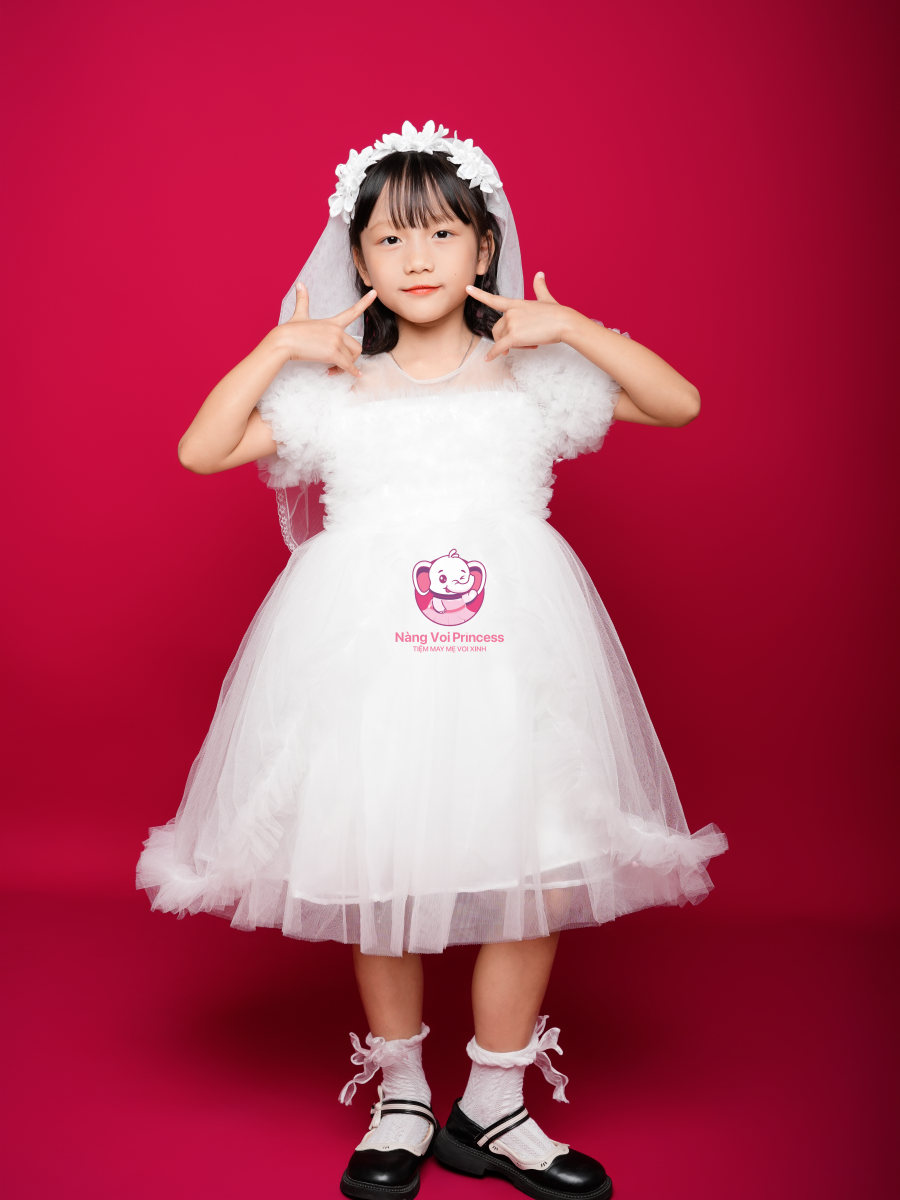 Chất Liệu Cao Cấp: Váy được làm từ chất liệu voan mềm mại với lớp lót lụa Habutai bên trong, giúp làn da của bé luôn được thoáng mát và an toàn.
